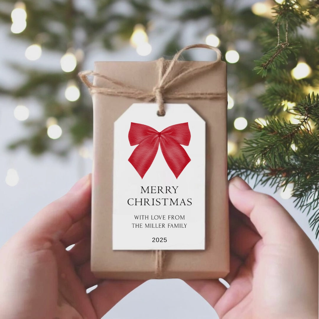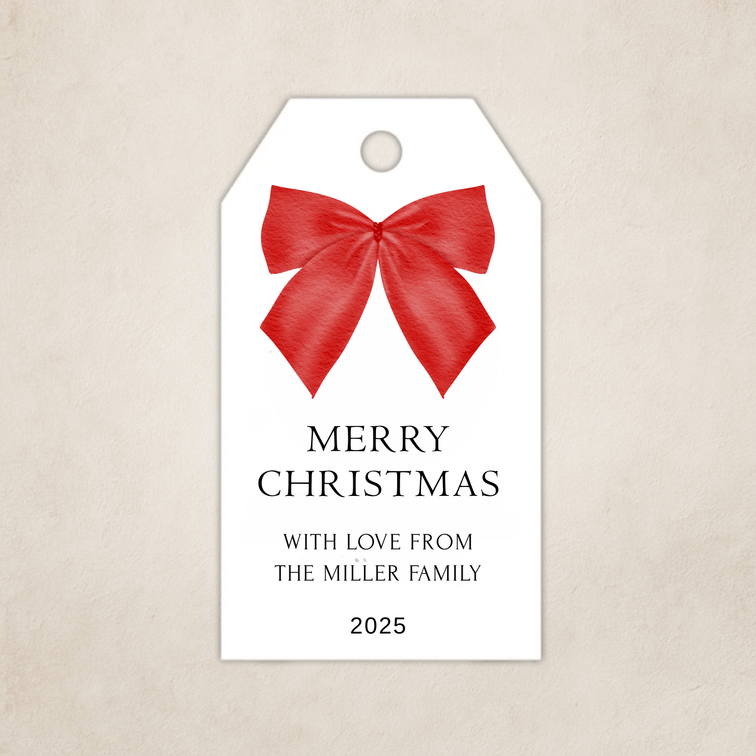Add a splash of festive cheer with our watercolor bow Christmas gift tags! These playful tags are perfect for sprucing up gift boxes, bags, or baskets, making every present feel extra special. Customize them with your family name, year and a holiday sentiment to add a personal touch that will delight your holiday guests.