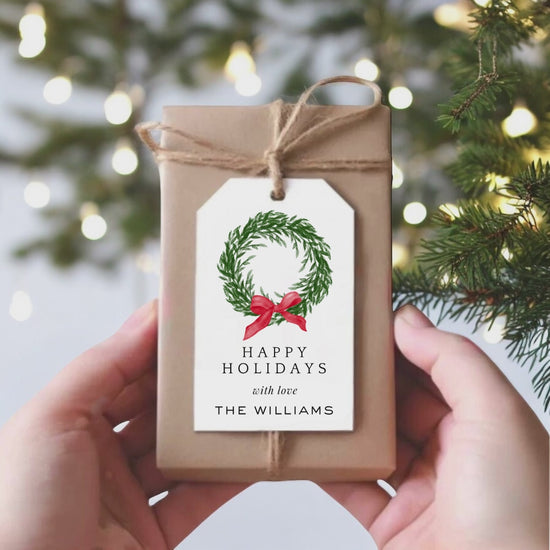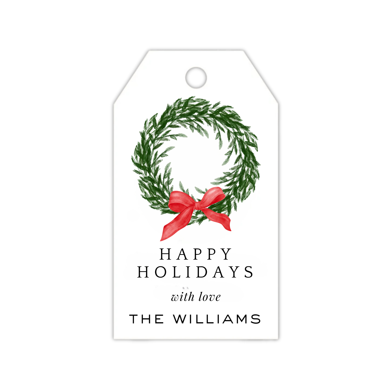 Wrap up the holidays with our personalized Christmas wreath gift tags. Perfect to add to gift boxes, gift bags or gift baskets, our festive wreath design makes for a charming addition to any holiday event. Personalize your favor tags with a warm holiday sentiment (Merry Christmas, Happy Holidays, Feliz Navidad or Joyeux Noel), a family name and year. Customize with your choice of 16 bow colors.