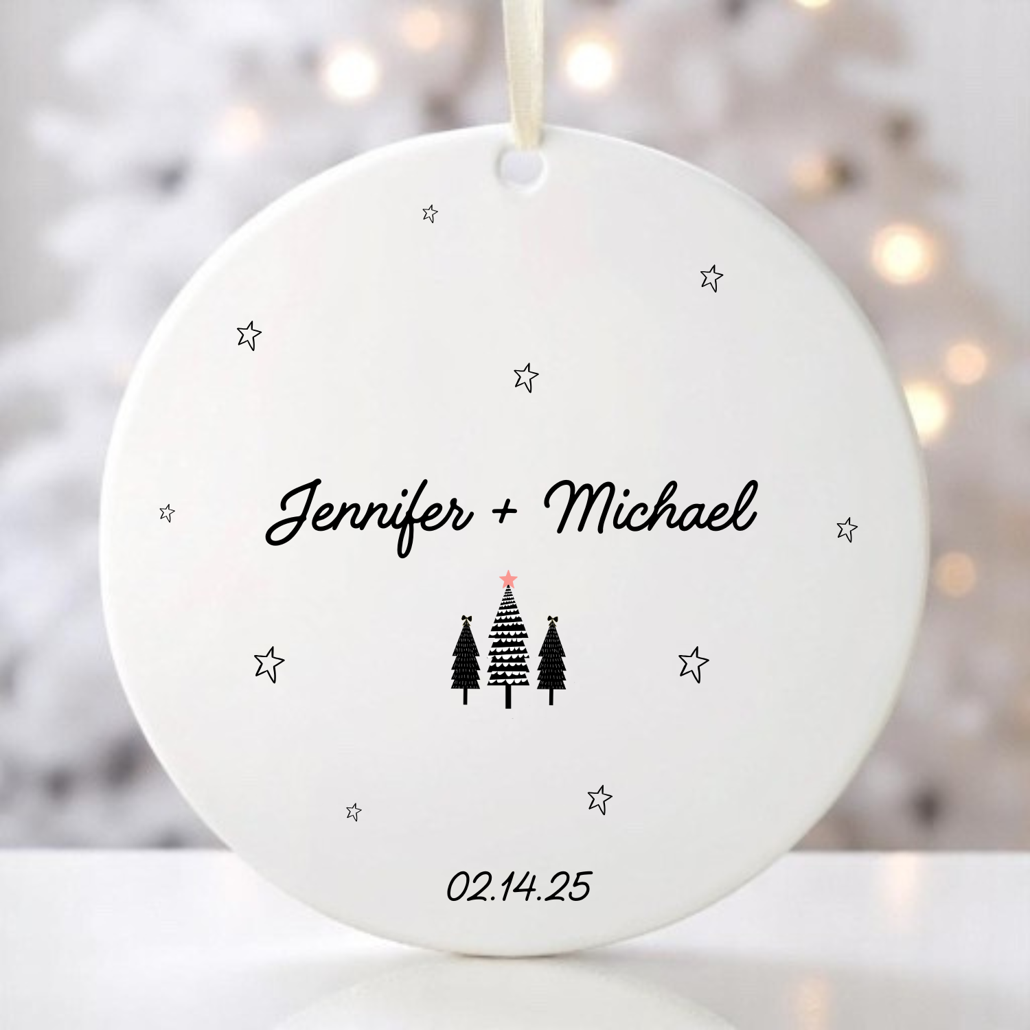 Celebrate the season with our personalized couple's ornament featuring a clean, minimalist design. Three delicate Christmas trees and stars frame the couple's names and special date. Our elegant keepsake makes a thoughtful stocking stuffer or meaningful holiday gift that commemorates your relationship.