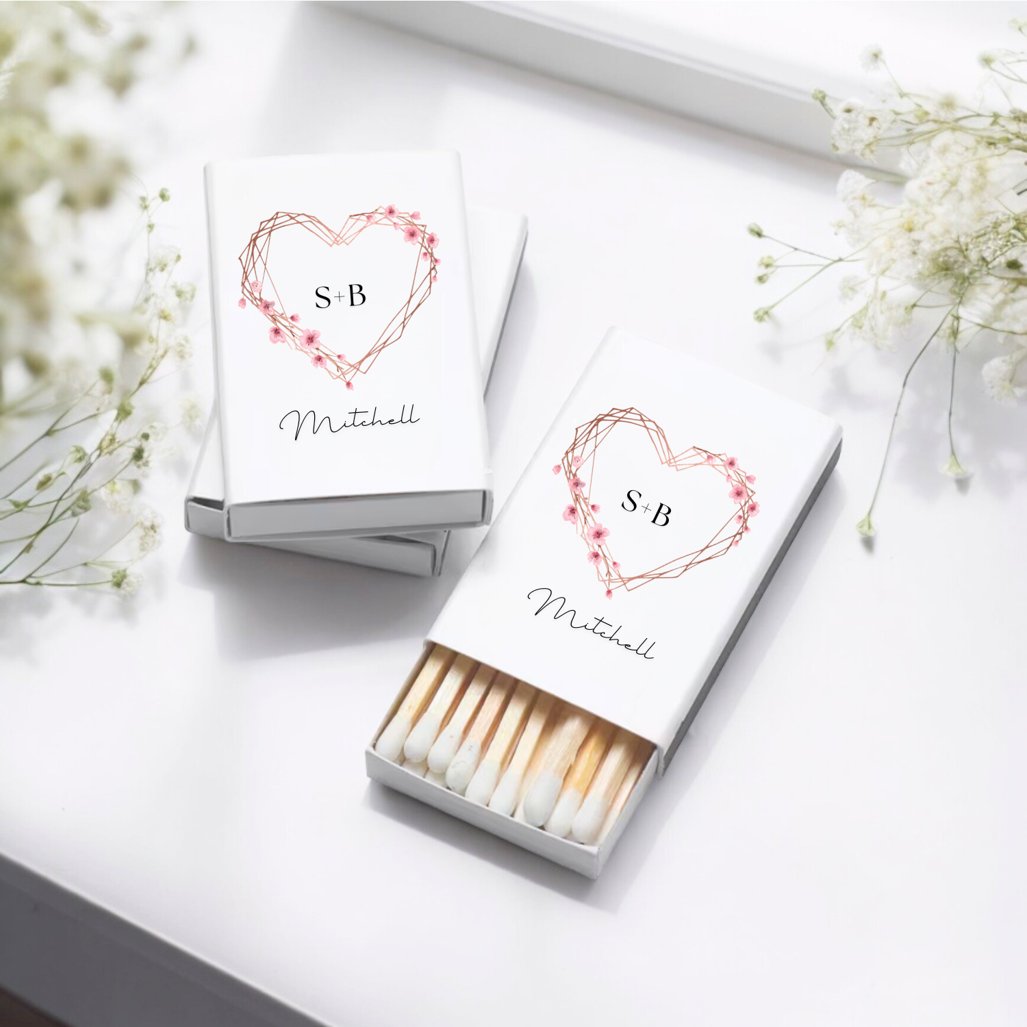 Our personalized safety matches feature a whimsical pink heart design and works well as personalized bridal or wedding shower favors or as anniversary party guest favors. Personalize these match favors with the couple's initials and last name for a truly unique thank you gift for guests. These custom matchboxes can be purchased alone or alongside our matching candles.
