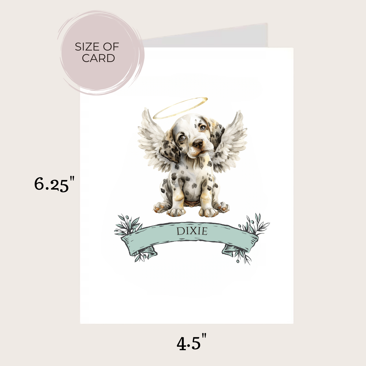 Celebrate the memory of your beloved Dalmatian dog or gift to a loved one mourning the loss of their furry friend with our personalized Dalmatian memorial card. Featuring a sweet Dalmatian dog with halo and wings, this custom greeting card is a heartfelt way to honor this sweet pup's life. Personalize with the beloved pet's name for a truly unique pet memorial gift.