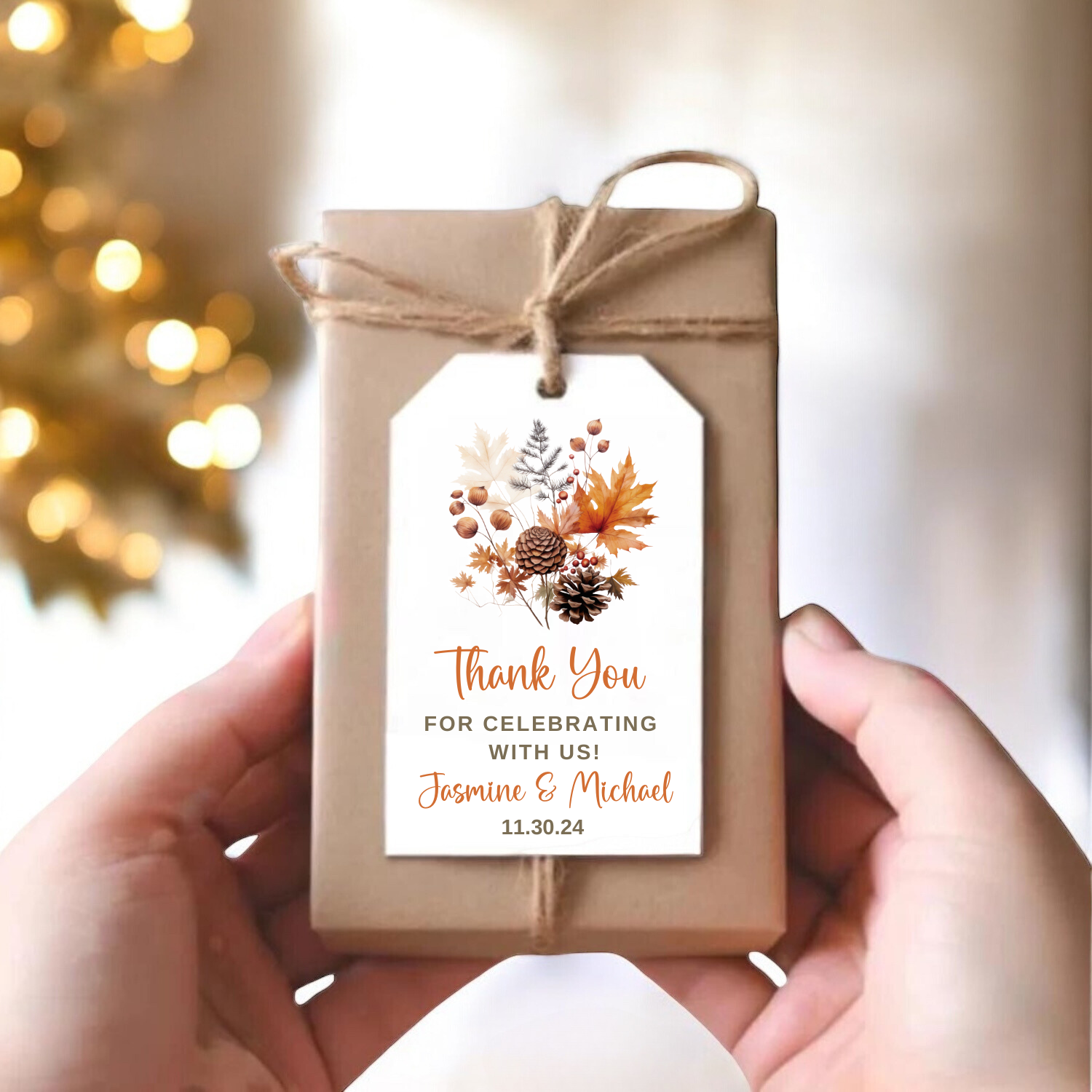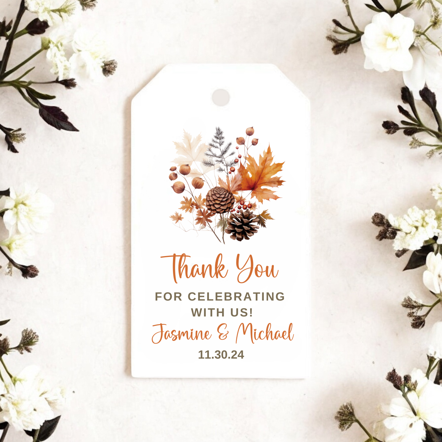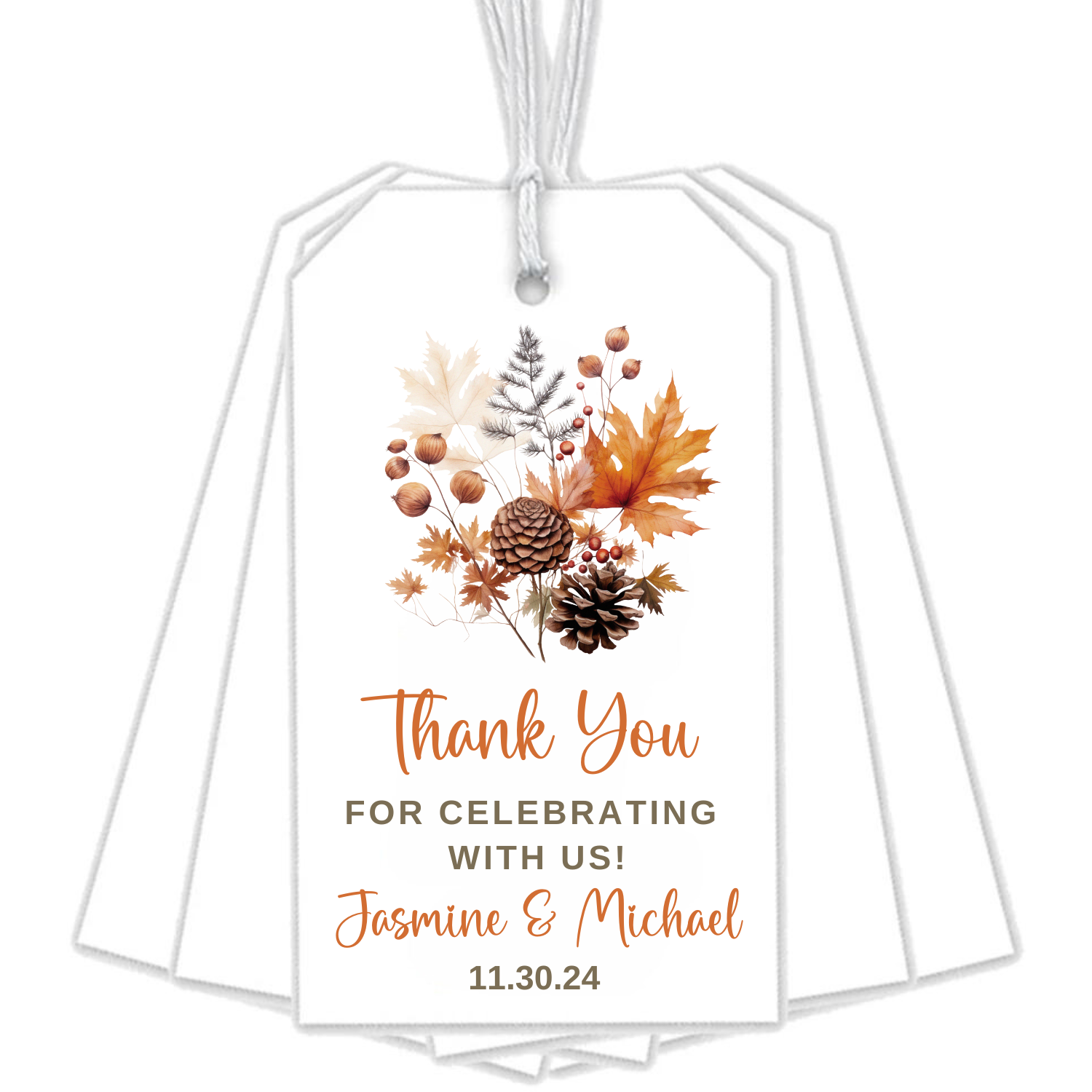 Celebrate your upcoming wedding or anniversary with our fall leaves wedding gift tags. Perfect to add to gift boxes, gift bags or gift baskets, our festive orange and brown fall leave design with the couple's name and wedding or event date and the sentiment "Thank you for celebrating with us" makes for a charming addition to any couple's fall event. Use on bridal shower or wedding favor gifts.