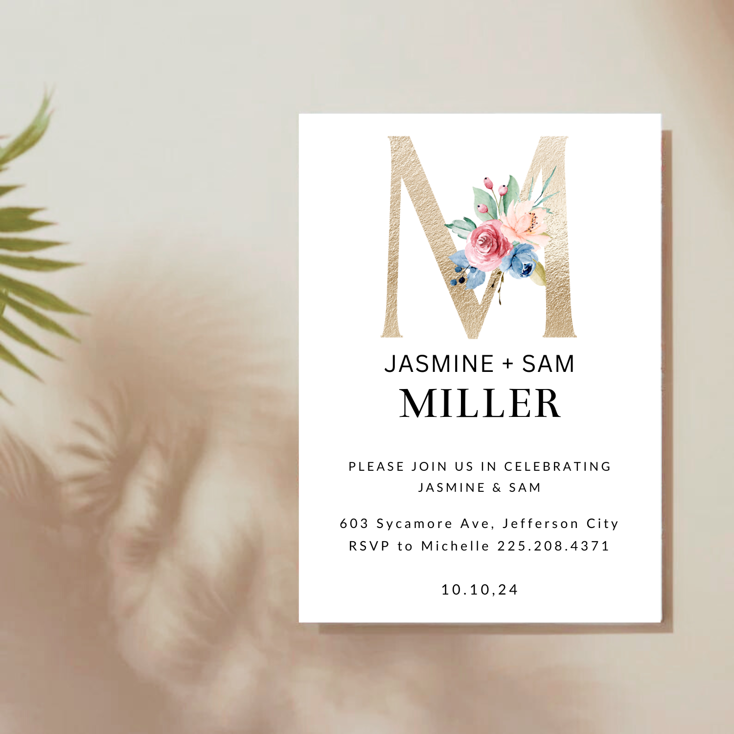 Welcome your guests in style with our gold floral initial invitations. Our personalized invitation features a minimalist gold initial with floral design personalized with the couple's first and last name, perfect for inviting your family and friends to your wedding or anniversary celebration. Get ready to celebrate with these charming invitations that will make your guests feel welcome and excited for the occasion.