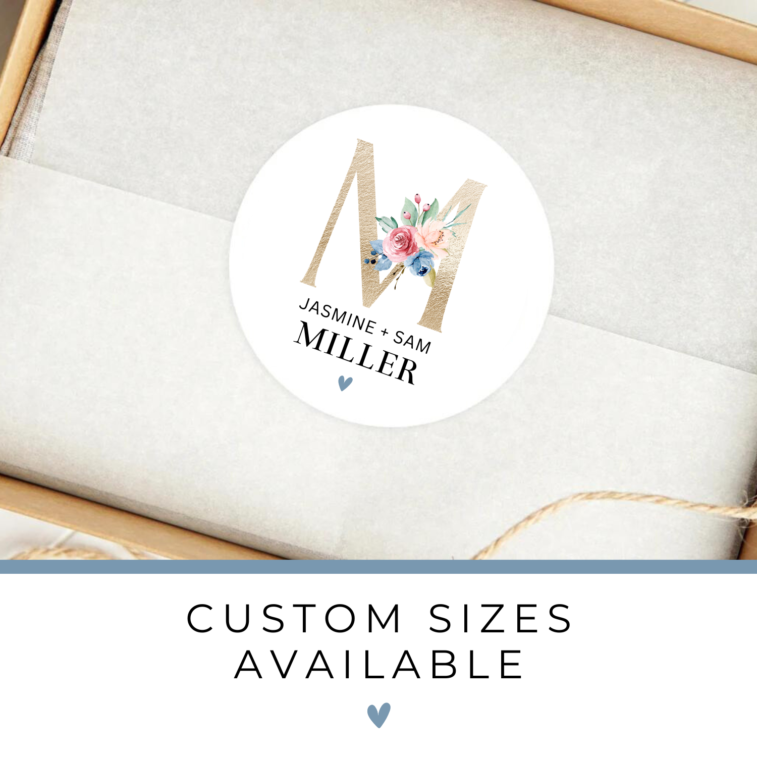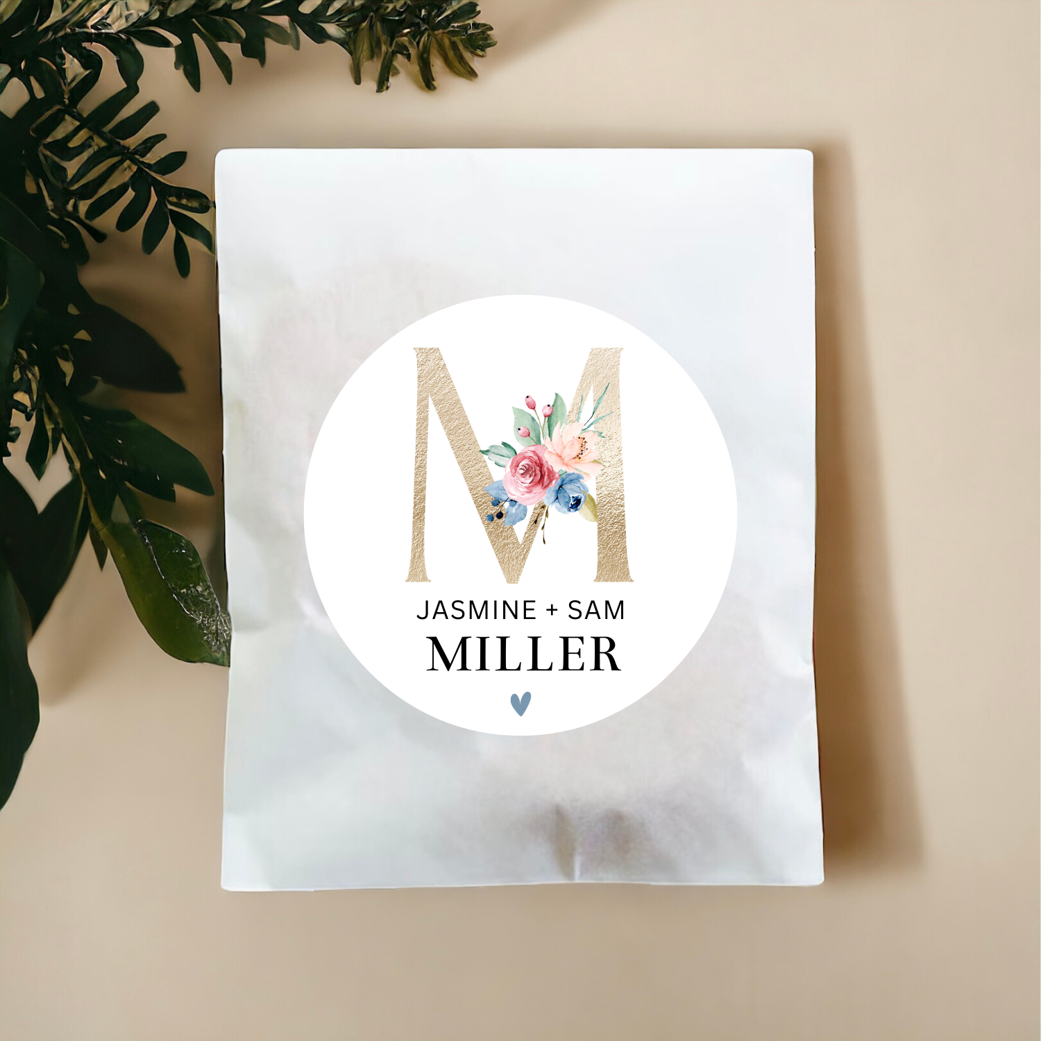 Celebrate your wedding or anniversary with our gold floral initial sticker labels. Placed on wedding and anniversary favors, bridal shower favors or party favors, the minimalist initial with floral design personalized with the couple's first and last name makes for a charming addition to any event. Adhere these personalized labels on gift bags, gift boxes, envelopes, candle tin cans and more.