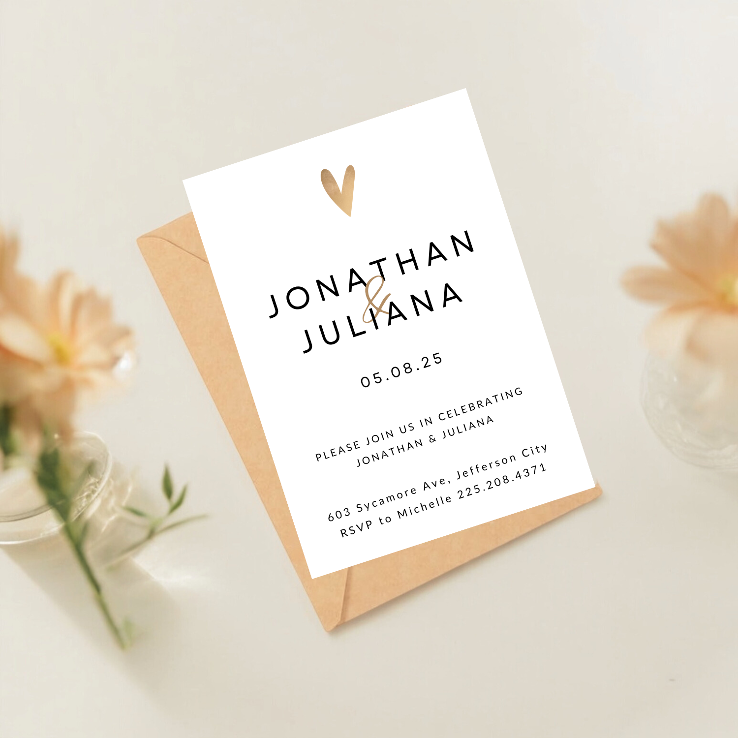 Welcome your guests in style with our minimalist gold heart invitations. Our personalized invitation features a minimalist gold heart design perfect for inviting your family and friends to your wedding or anniversary celebration. Get ready to celebrate with these charming invitations that will make your guests feel welcome and excited for the occasion.