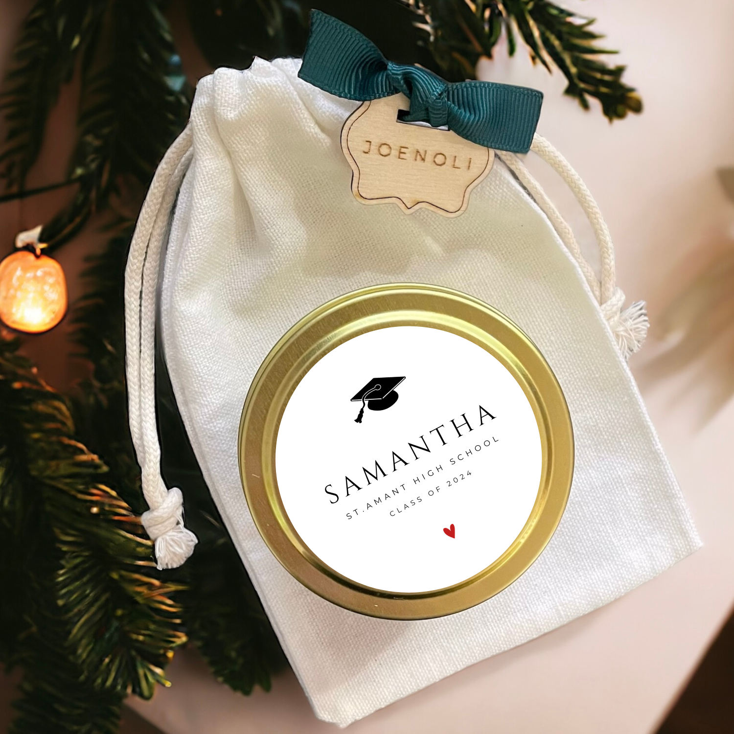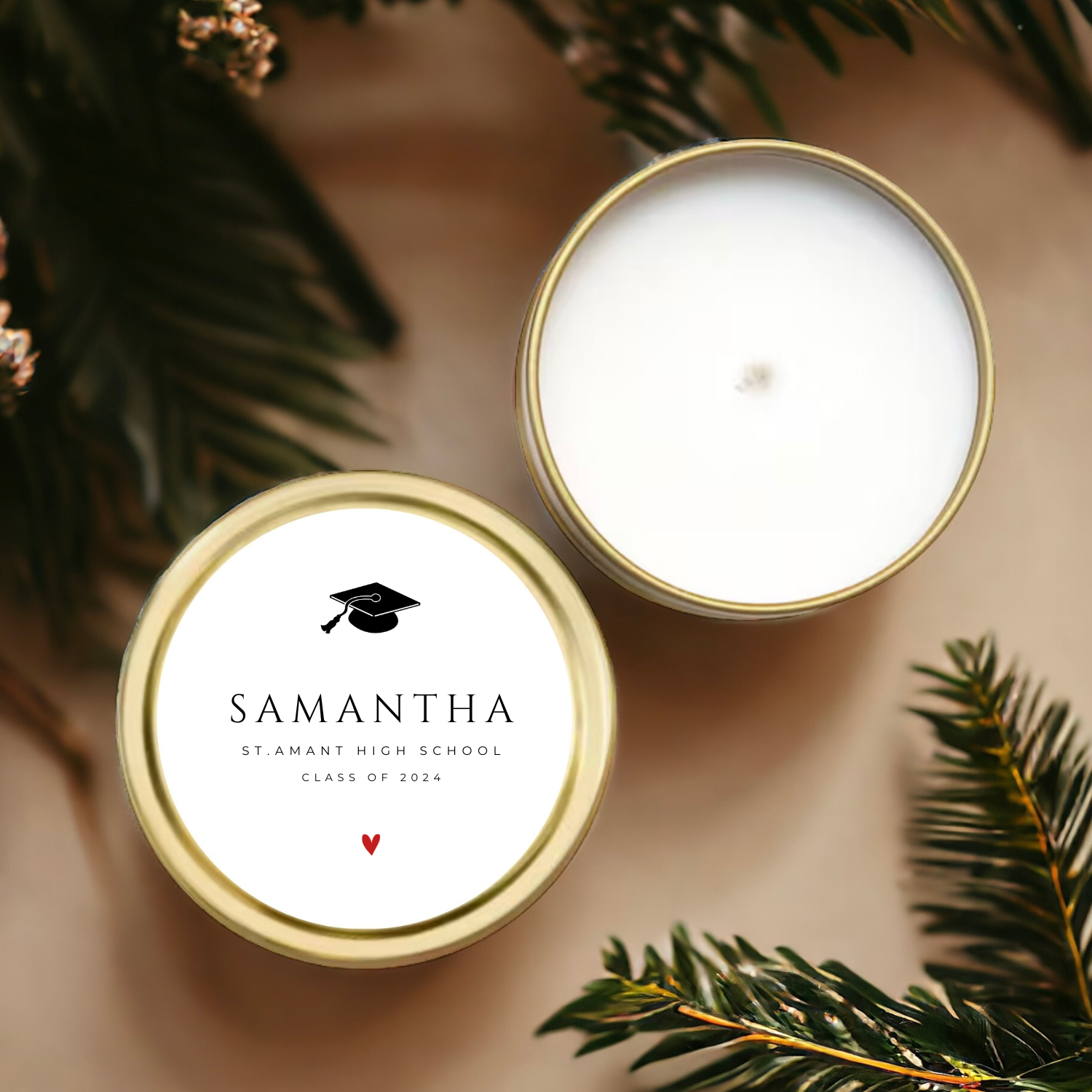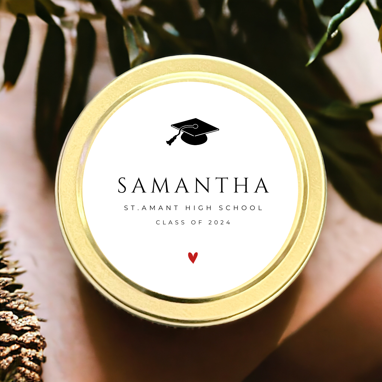 Celebrate your graduate's achievement with our graduation candle favors. These minimalist candles feature a graduation cap design, along with the graduate's name, school, and graduation year. These gold tin candles can also be used as dinner party table favors or add them to gift bags, boxes and baskets for a personalized touch.