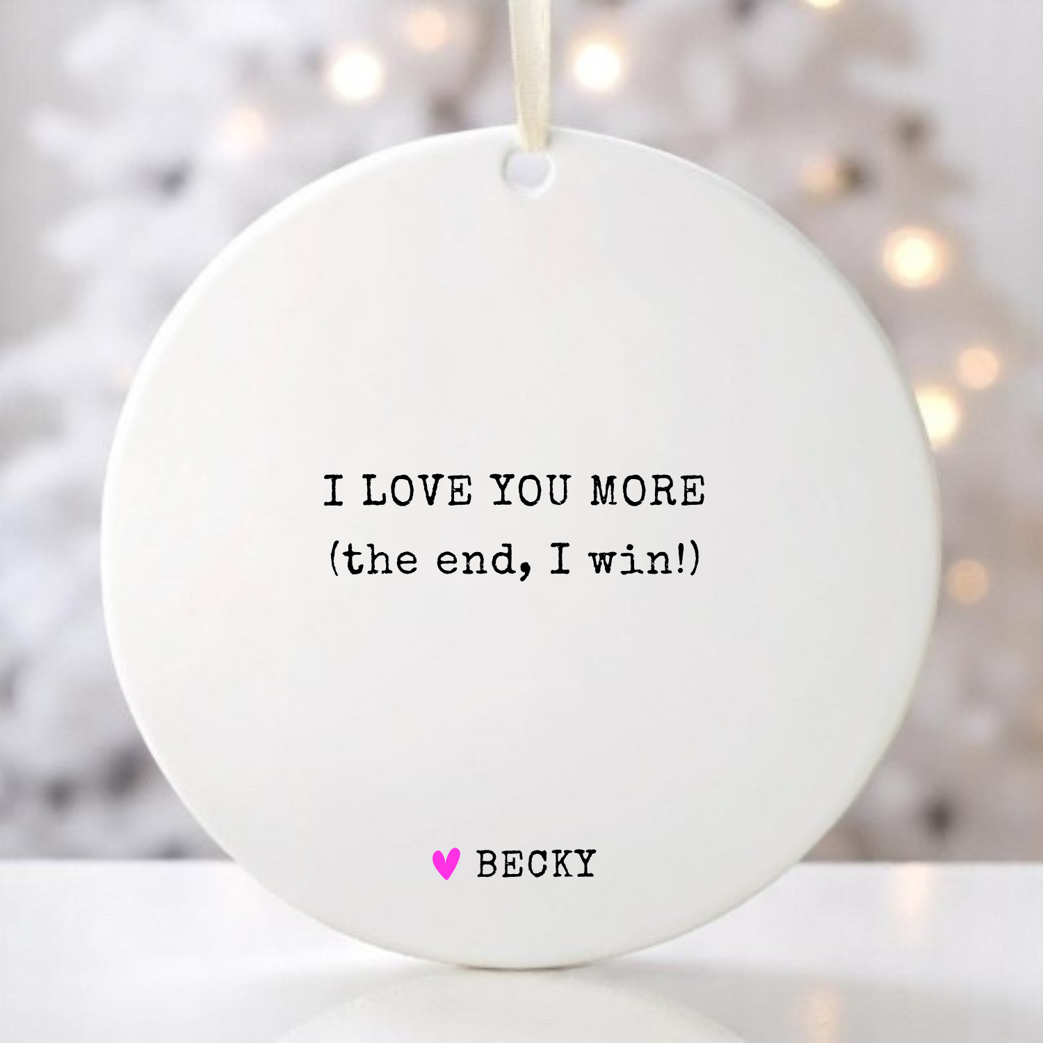 Settle the "I love you more" debate once and for all with our charming ornament that playfully declares "I love you more (the end, I win)." Perfect for couples to hang during Christmas or display year-round as a keepsake. Surprise your special someone on birthdays, Valentine's Day, anniversaries, or just because you want to win today's round of affection.