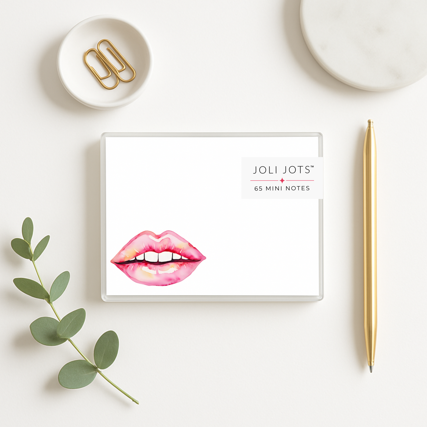 Leave a little love wherever you go with JOLI JOTS™! Our set of 65 mini note cards features a bold red lipstick kiss and playful hearts, perfect for adding a romantic or flirty touch to gifts, lunchboxes, mirrors, or desks. Whether you're spreading smiles or sealing it with a kiss, these pretty little notes are a charming way to make someone’s day.