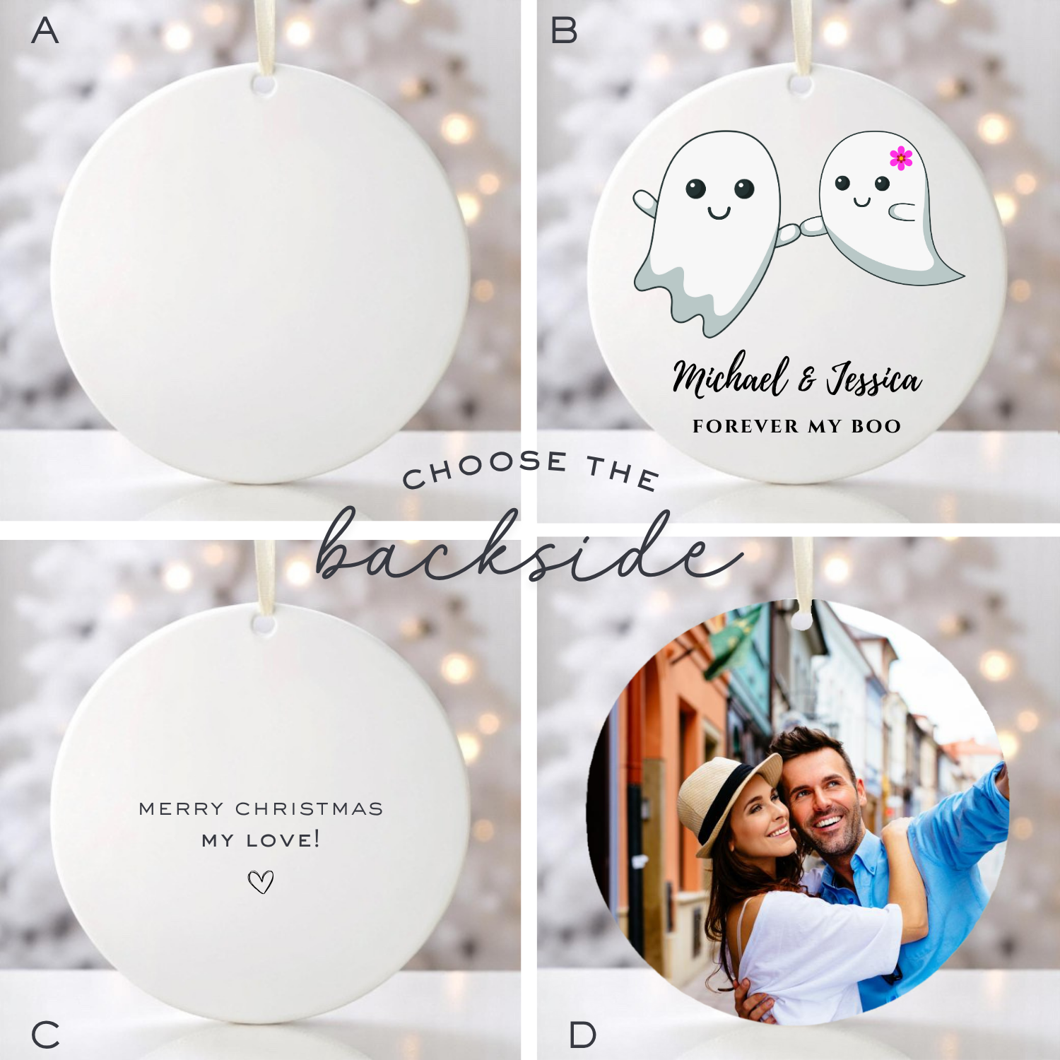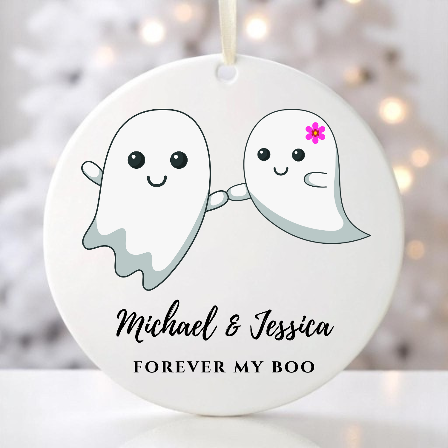 Celebrate Halloween with our couple's "Forever My Boo" ornament, personalized with your names. This festive keepsake combines spooky charm with romantic sentiment, creating a unique Halloween decoration that commemorates your special bond. A perfect addition to your seasonal décor or thoughtful gift for couples who embrace the Halloween spirit.