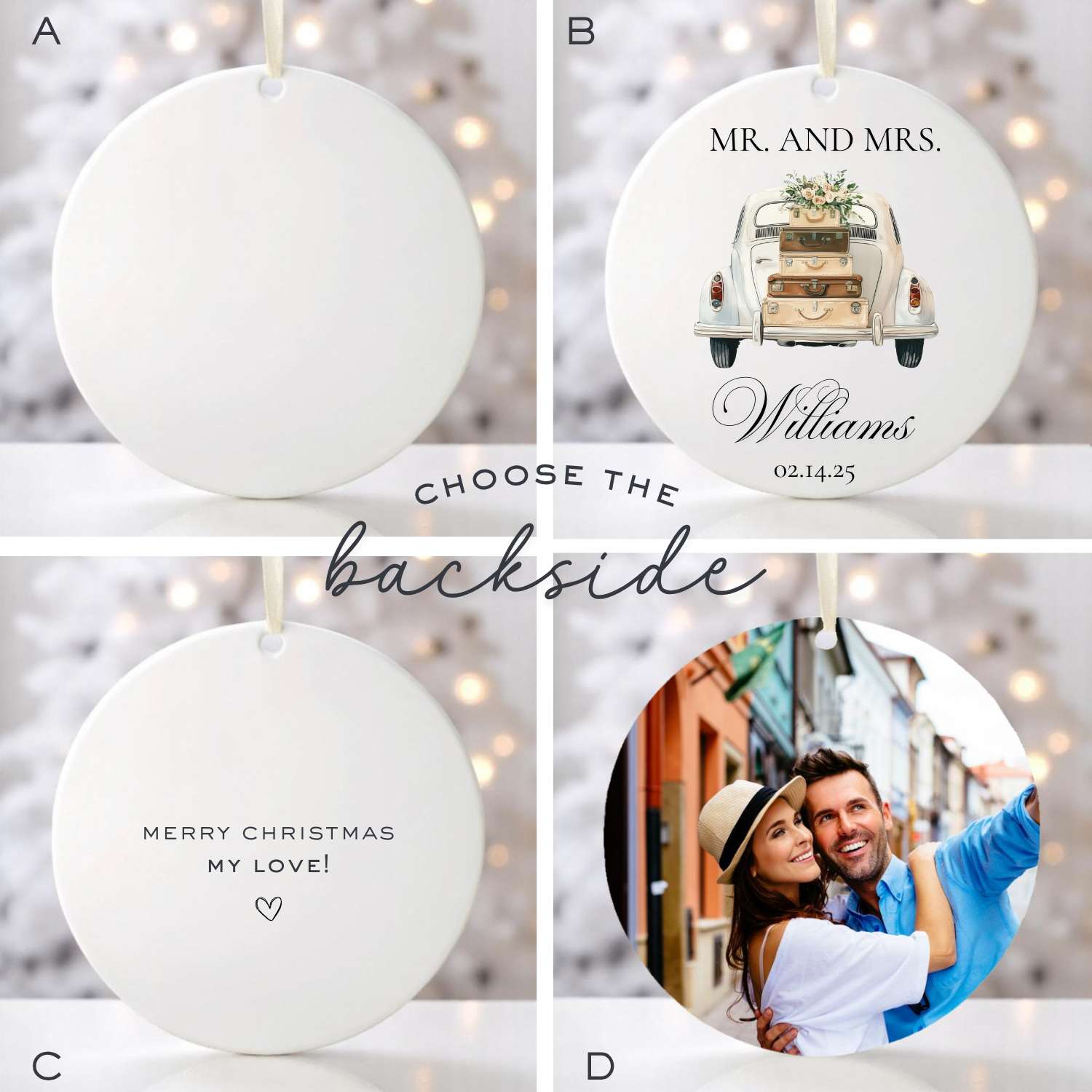 Our white, ceramic Christmas ornaments are 2.75" and are offered in three styles. Choose to have your chosen design on one side, both sides, or customize the back of your ornament with a short message or photo.