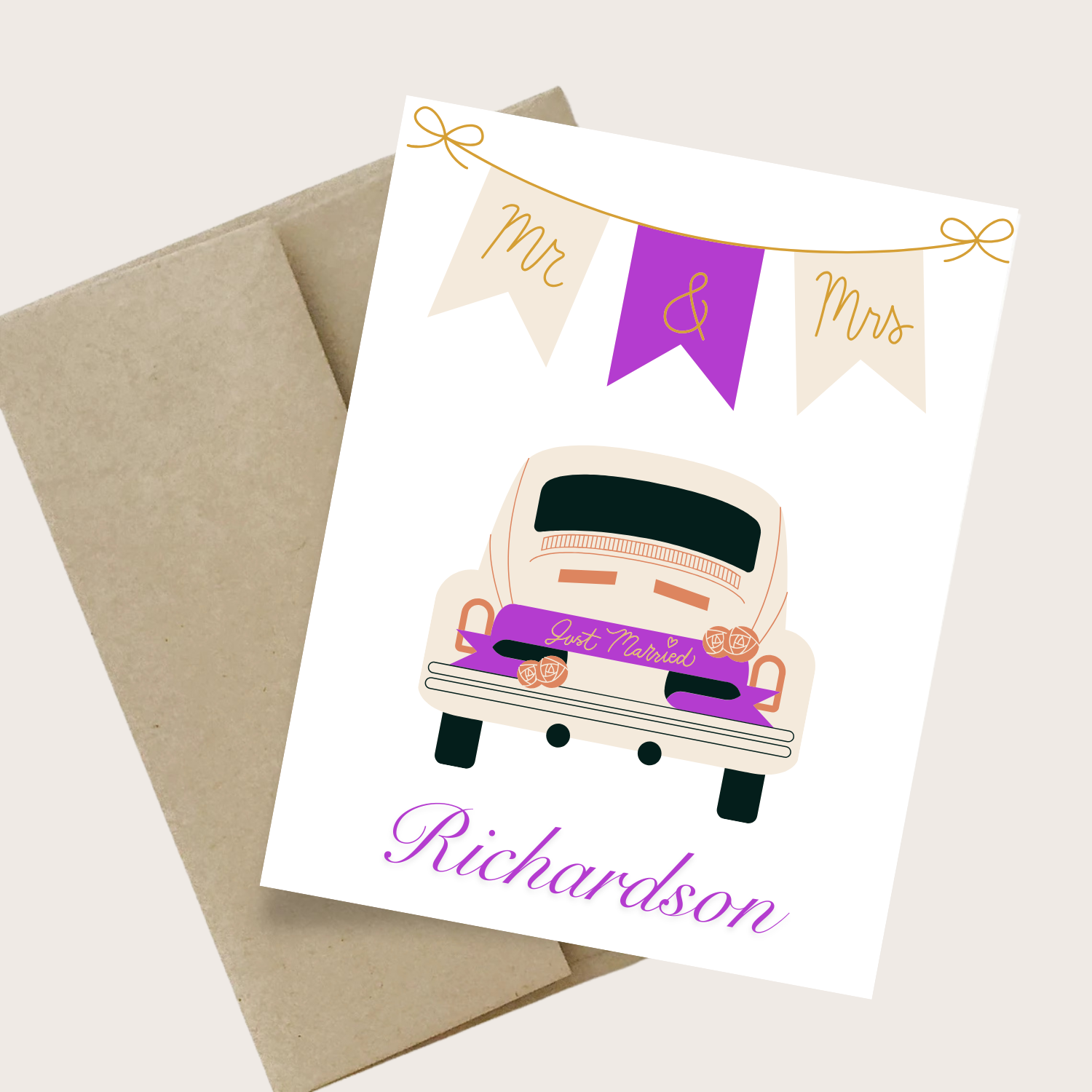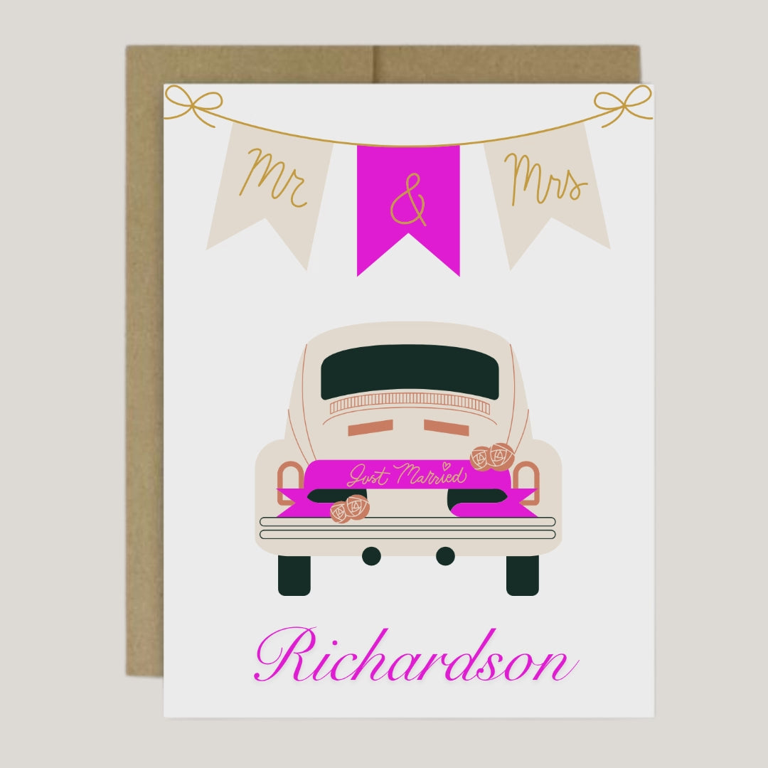 Celebrate the newlyweds with our playful Mr. & Mrs. card featuring a festive banner and a just married car. Customize it with the couple’s last name for a personal touch. Ideal for weddings, showers, anniversaries, or as a charming gift for the happy couple.