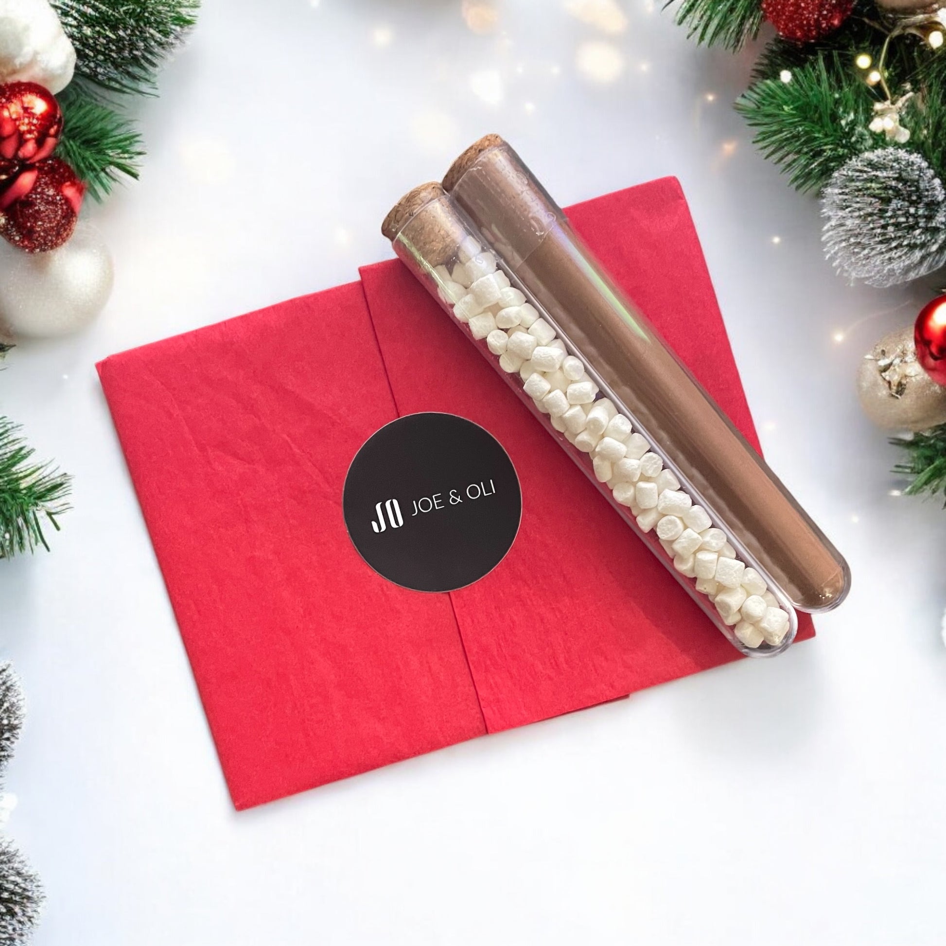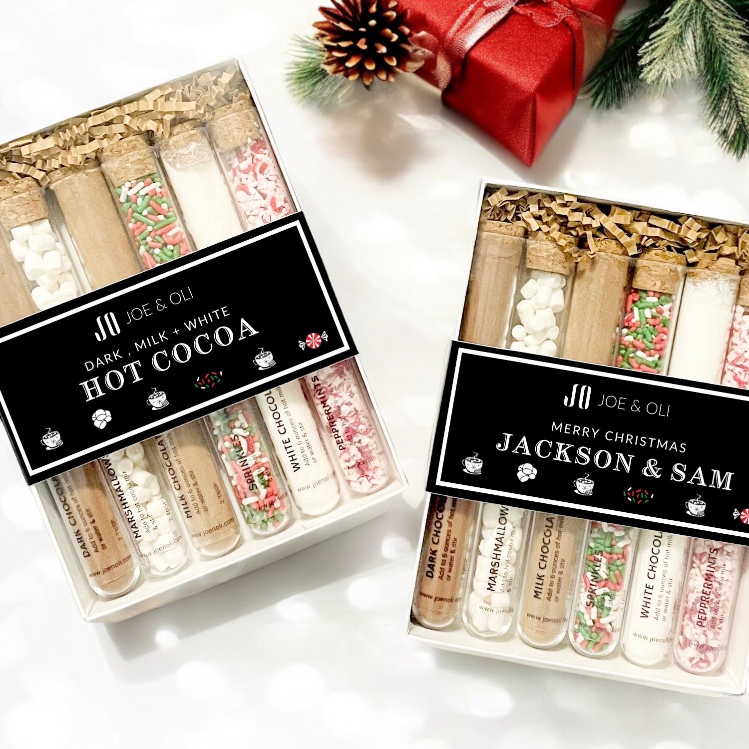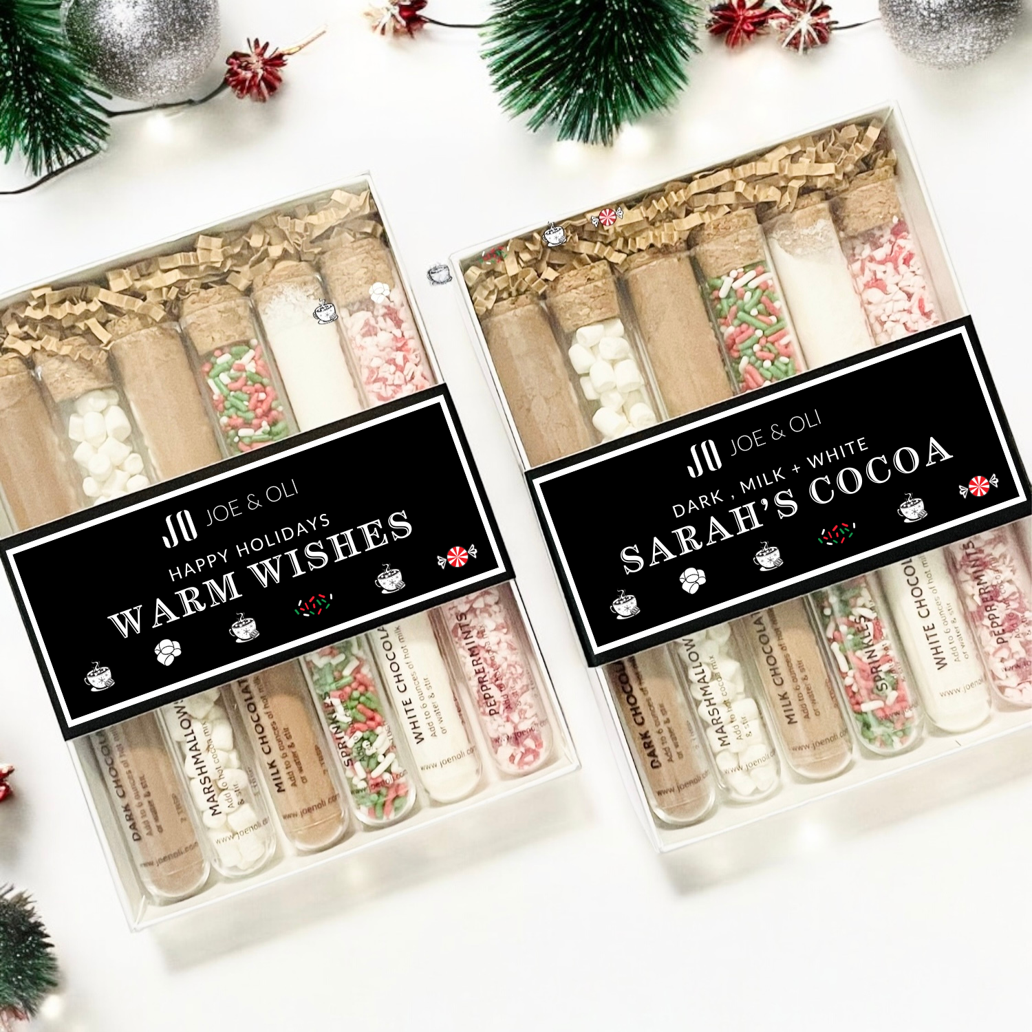 Indulge in the ultimate holiday treat with our personalized hot chocolate gift set. Featuring rich milk, white, and dark chocolate, and crushed peppermints, sprinkles, and mini marshmallows, our custom holiday cocoa gift can be personalized with a name and sentiment of your choosing. Perfect for Christmas, corporate gifting, and more.