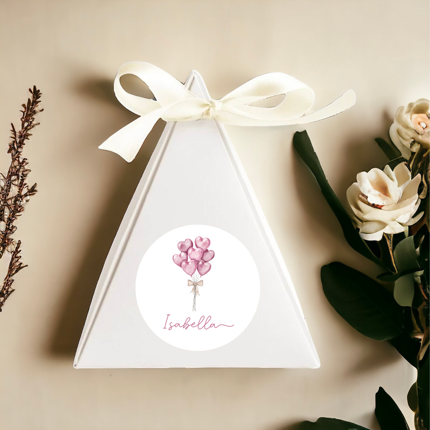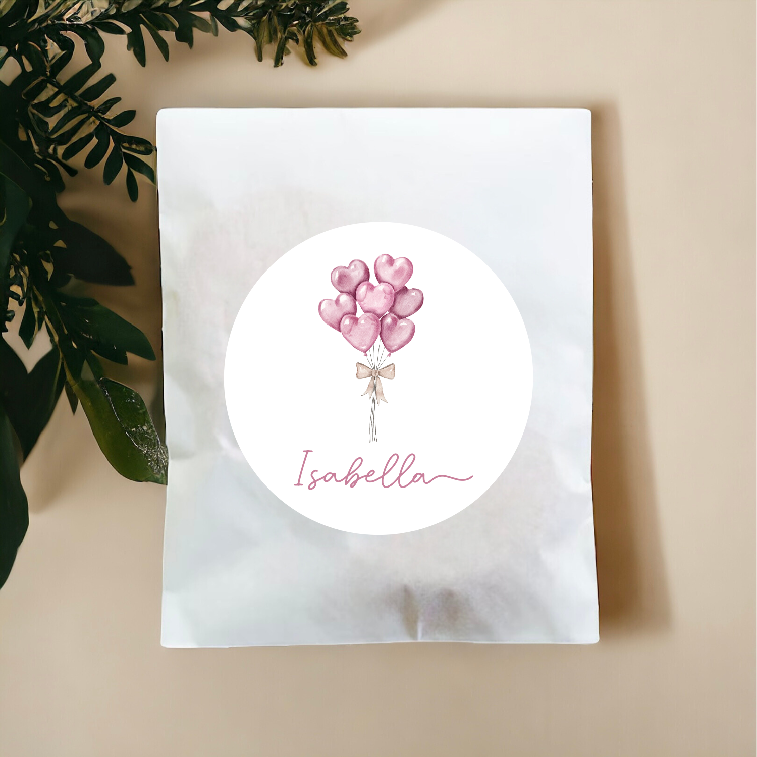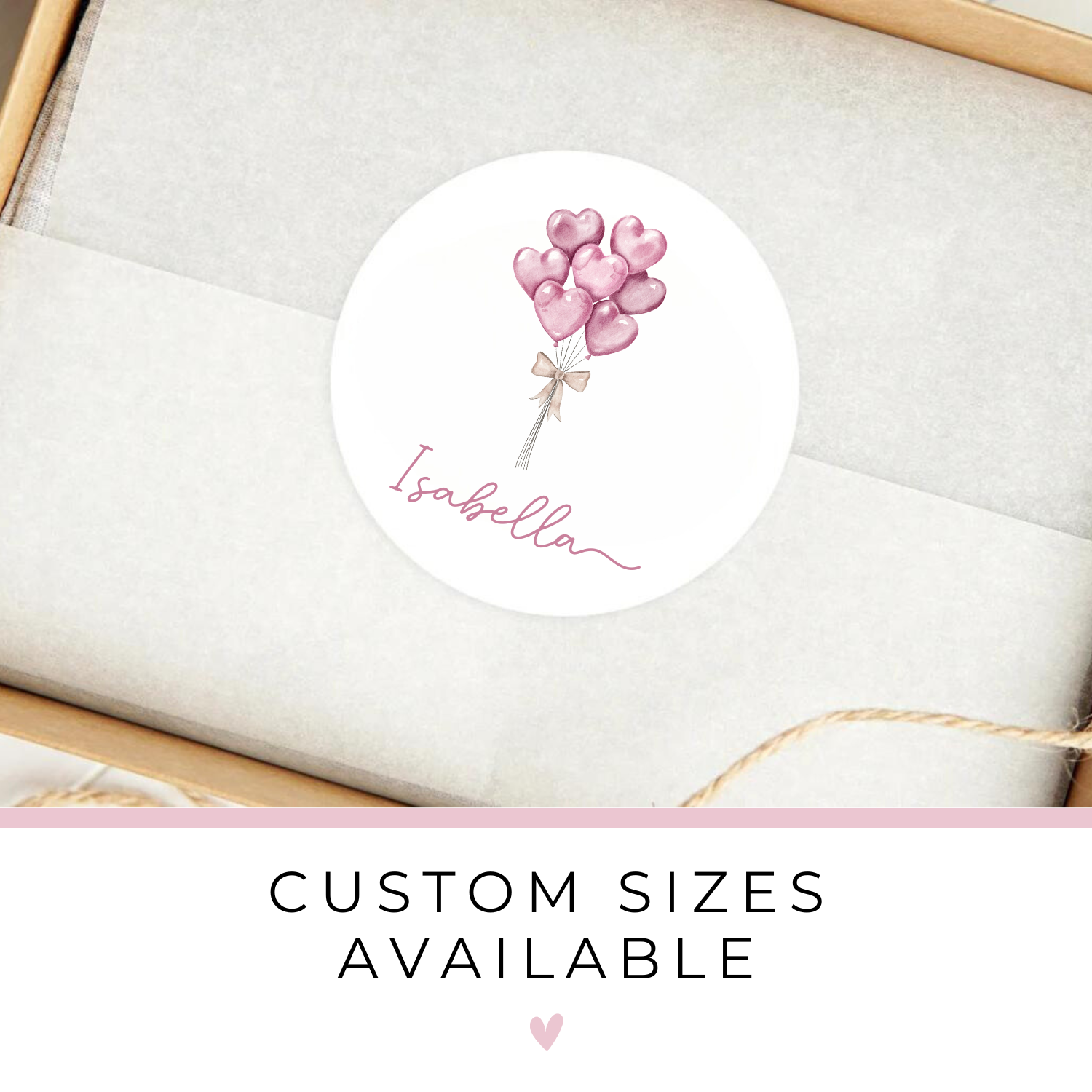 Celebrate your loved one's birthday with our pink heart balloons labels. Placed on birthday initiations, birthday favors and baby shower favors, our pink balloon bouquet design personalized with a name and birthday or event date makes for a charming addition to any birthday celebration.