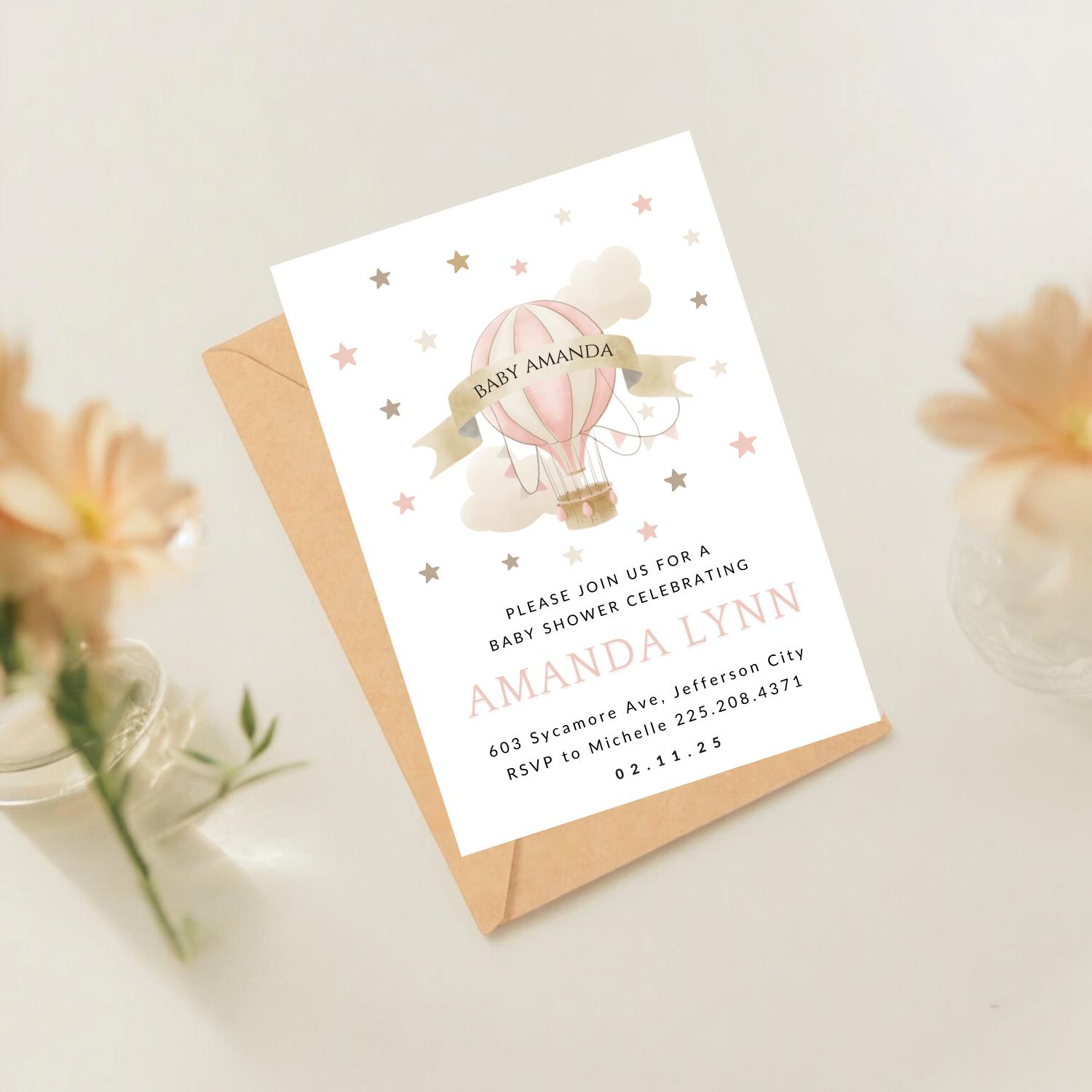 Welcome your guests in style with our pink hot air balloon invitations. Our personalized invitation features a whimsical pink hot air balloon design perfect for inviting your family and friends to your pink or hot air balloon- themed baby shower celebration. Get ready to celebrate your new baby with these charming invitations that will make your guests feel welcome and excited for the occasion.