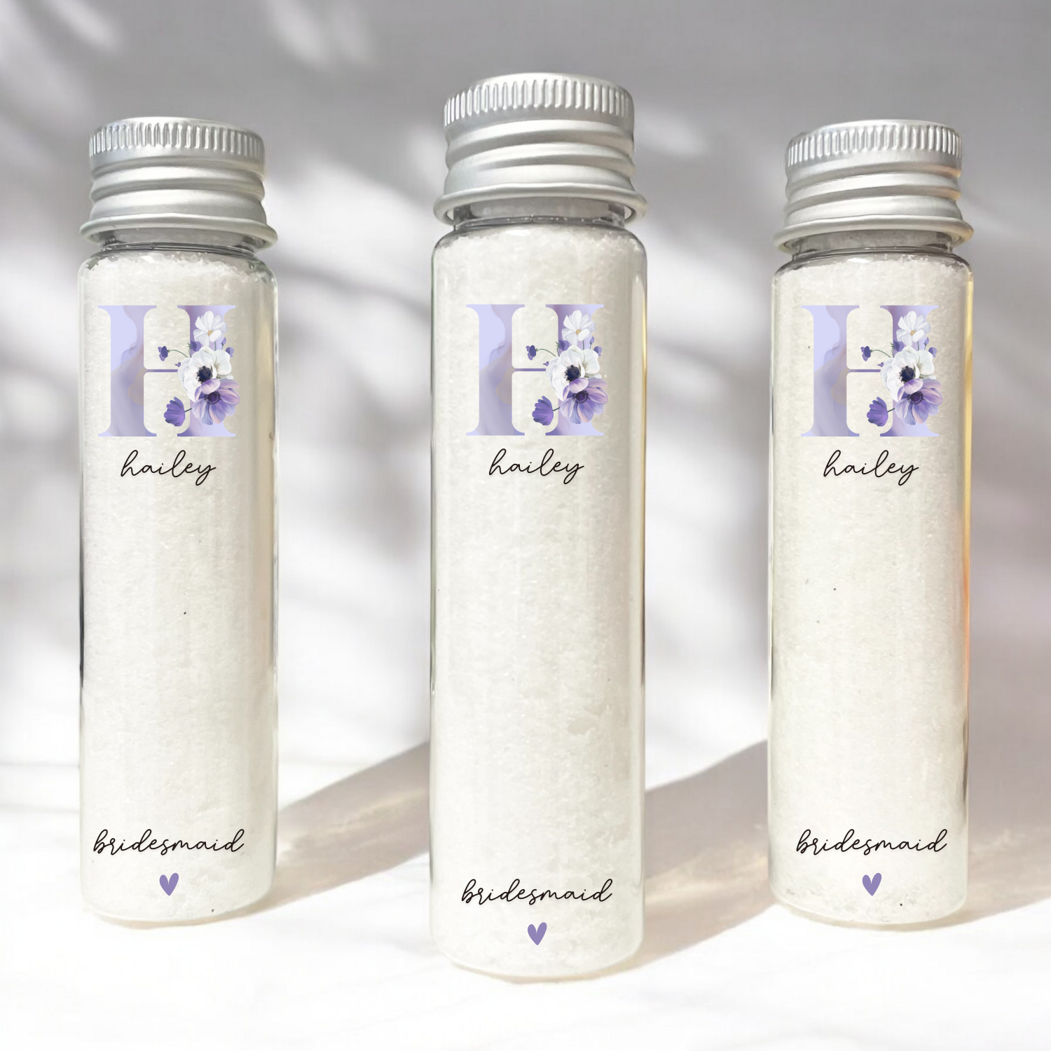 Each bath salt tube will have an initial, name and bridal party role. Add a short, personalized message on the back to add a special touch to these personalized shower favors.
