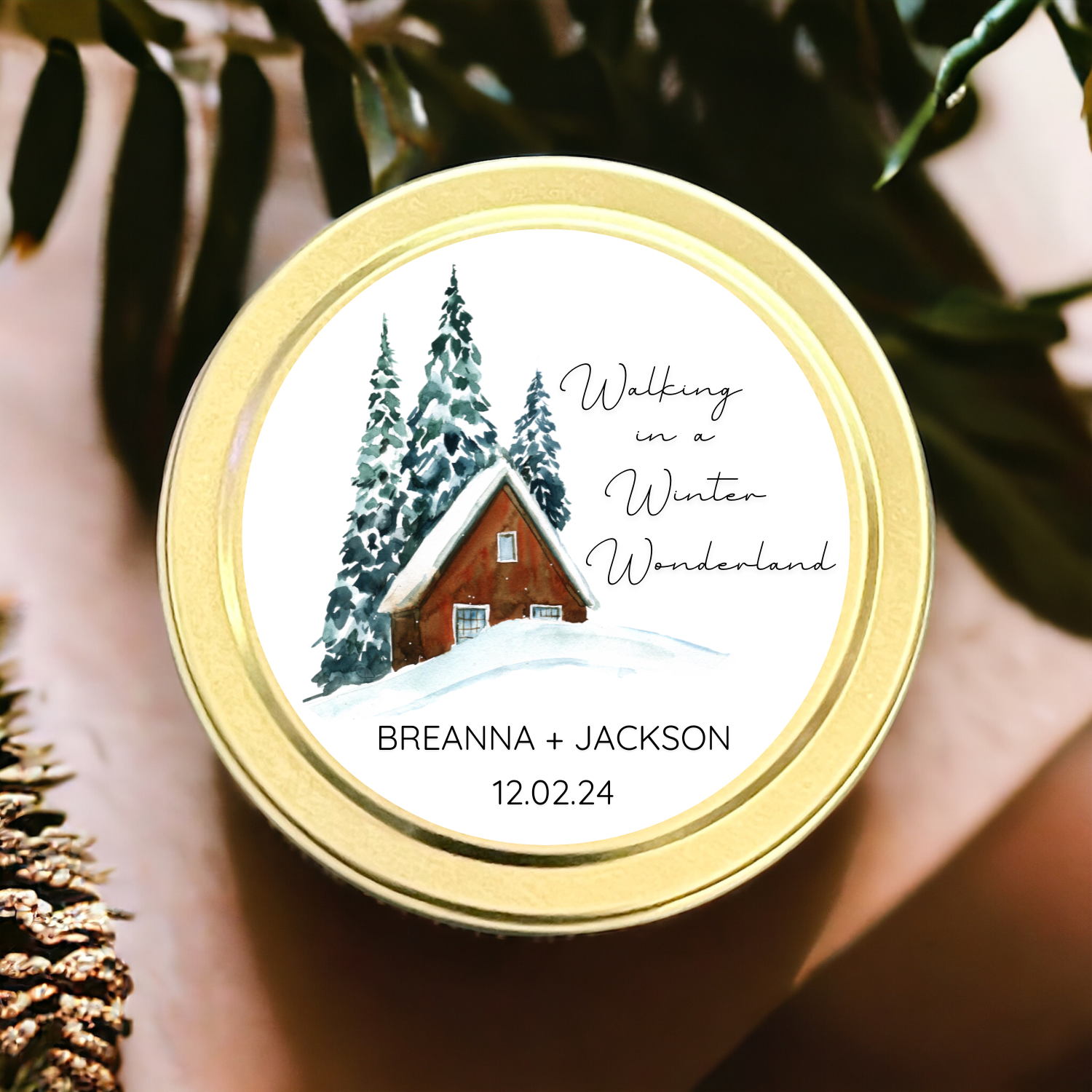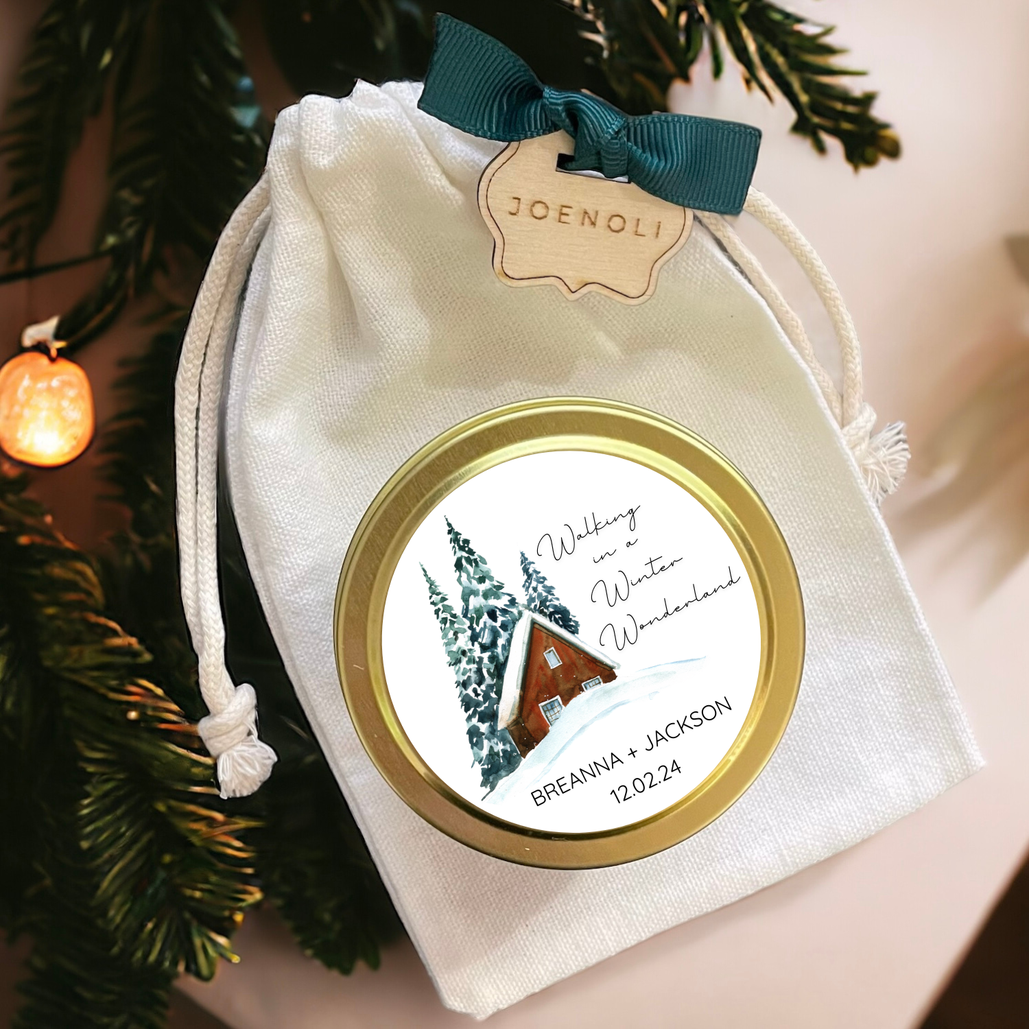 Add a charming touch to your wedding celebration with our winter wonderland candle. The winter-themed cabin and pine trees, along with the couple's names and wedding or event date and "walking in a winter wonderland" sentiment make these wedding or anniversary candle favors perfect for any couples Christmas or winter event. Use them as favors for weddings, anniversaries, bridal showers, or as stocking stuffers. These gold tin candles also make beautiful dinner party table favors and customizable additions to gift bags, boxes, and baskets.